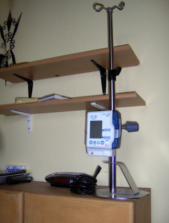 Ernährungspumpe mit Tropfständer im Schlafzimmer - passten leider nicht in den Ausguss...